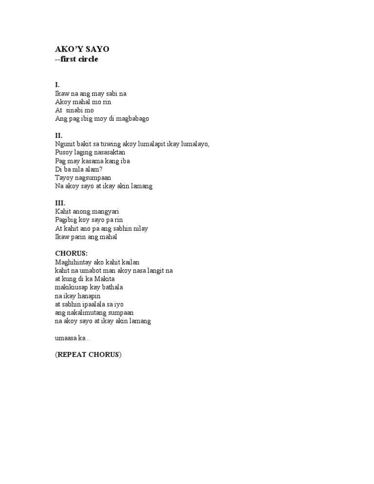 Akoy sayo at ikaw sa akin. Akoy Sayo Ikay Akin Lyrics. First Circle akoy sayo at ikay akin lamang lyrics. Akoy Sayo Ikay Akin Lyrics.