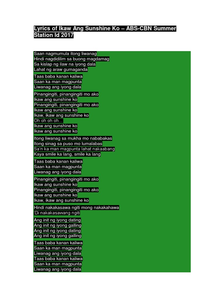 Play online or download to listen offline - in HD audio only on JioSaavn. There are 60 lyrics related to Ikaw Ang Sunshine Ko. ABS-CBN - Ikaw Ang Sunshine Ko Isang Pamilya Tayo.