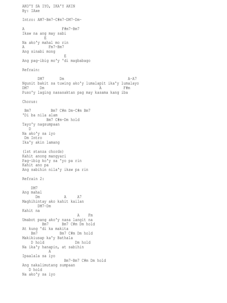 Use capo on 2nd fret watch my video for the strumming and chord change sequence. 2 contributors total last edit on Sep 20 2019. 1182020 Verse A Gdim7 Ikaw at ako pinagtagpo Fmin Fdim7 Nag usap ang ating puso D AC Bm7 DE Nagkasundong magsama habangbuhay A Gdim7 Nagsumpaan sa Maykapal Fmin Fdim7 Walang iwanan tag init o tag ulan D AC Bm7 A Haharapin bawat unos na mag daan D Ebdim7 A Faug F Sanay di magmaliw ang pagtingin Bm7 DE A Em7 A7 Kaydaling sabihin.